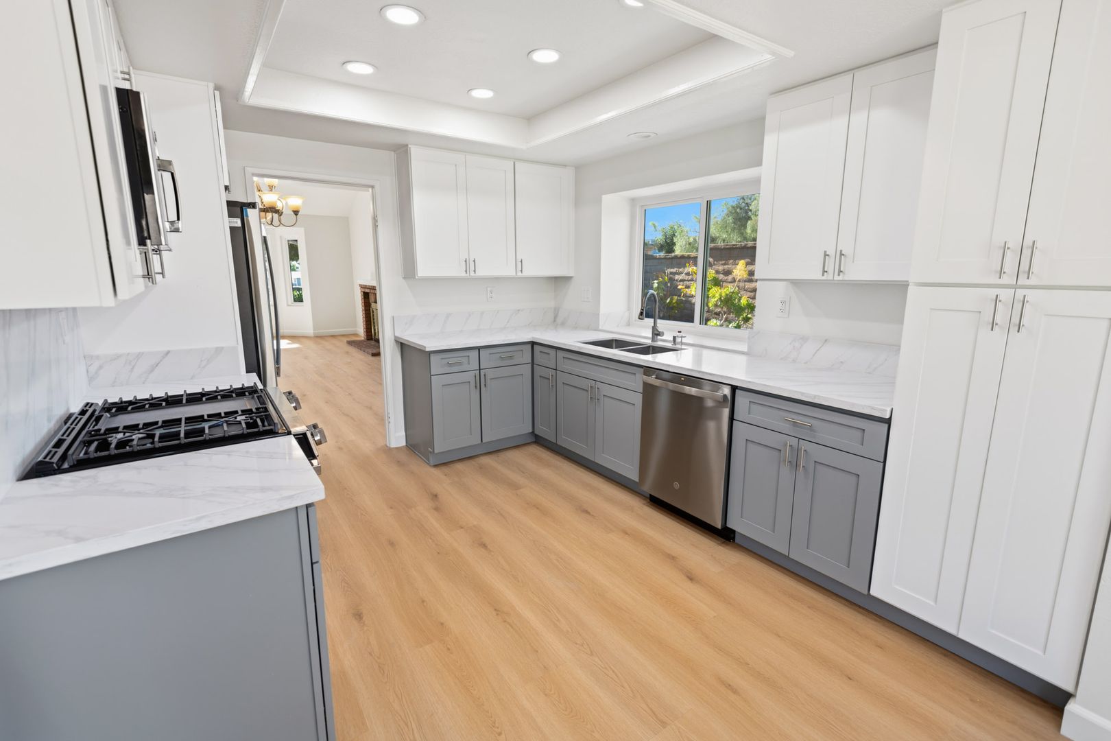 The kitchen has been recently updated with new cabinetry, quartz countertops, stainless steel appliances, and a breakfast nook. Bedrooms are generously sized, and the home includes an interior laundry room and an attached two-car garage.